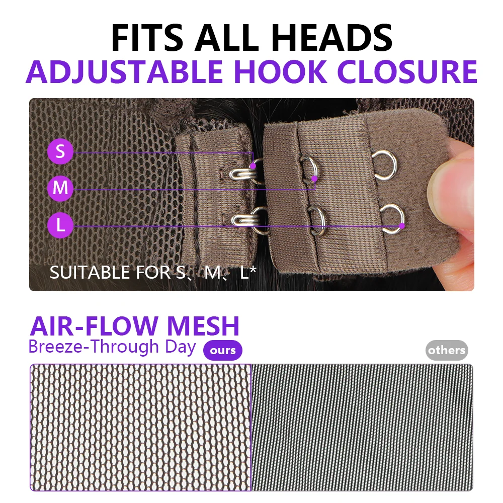 3.Hidden Strap HD Lace Front Wigs Human Hair Cap Size:Adjustable Hidden Strap Wig Size(21.5-22.5 Inch) for Most People,Glueless Wig With 4 Combs And Adjustable Straps,Friendly for the Beginner Install. You Must Love It.