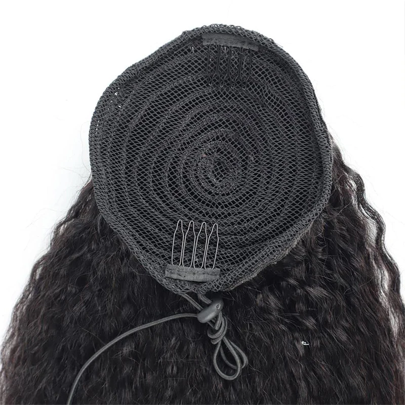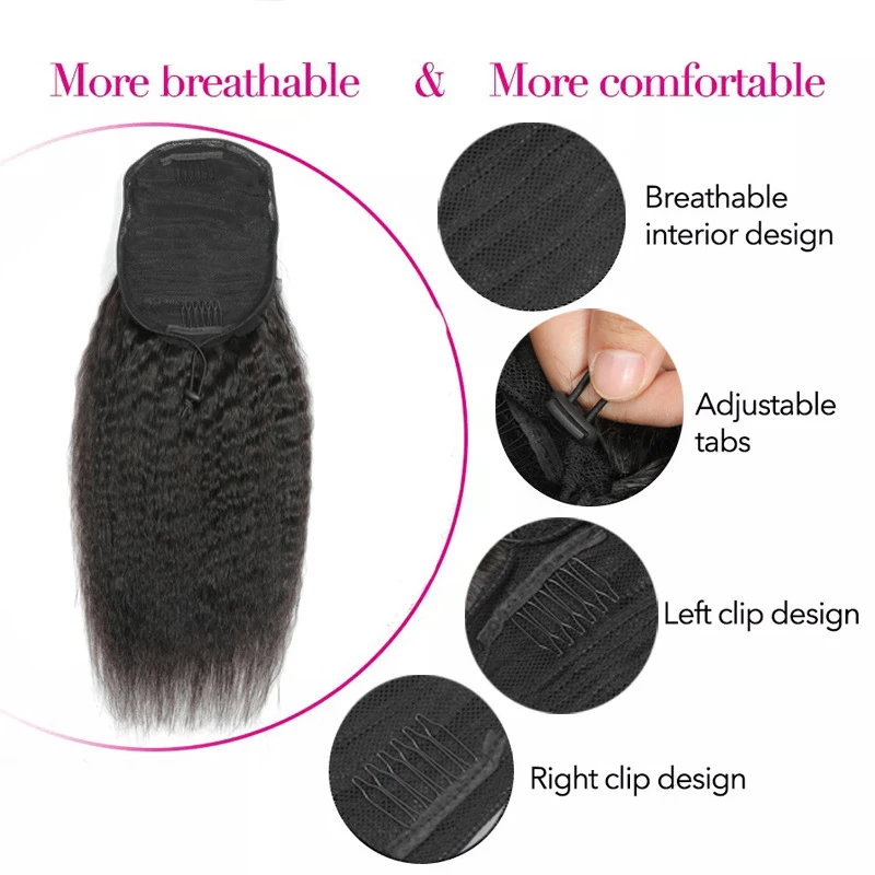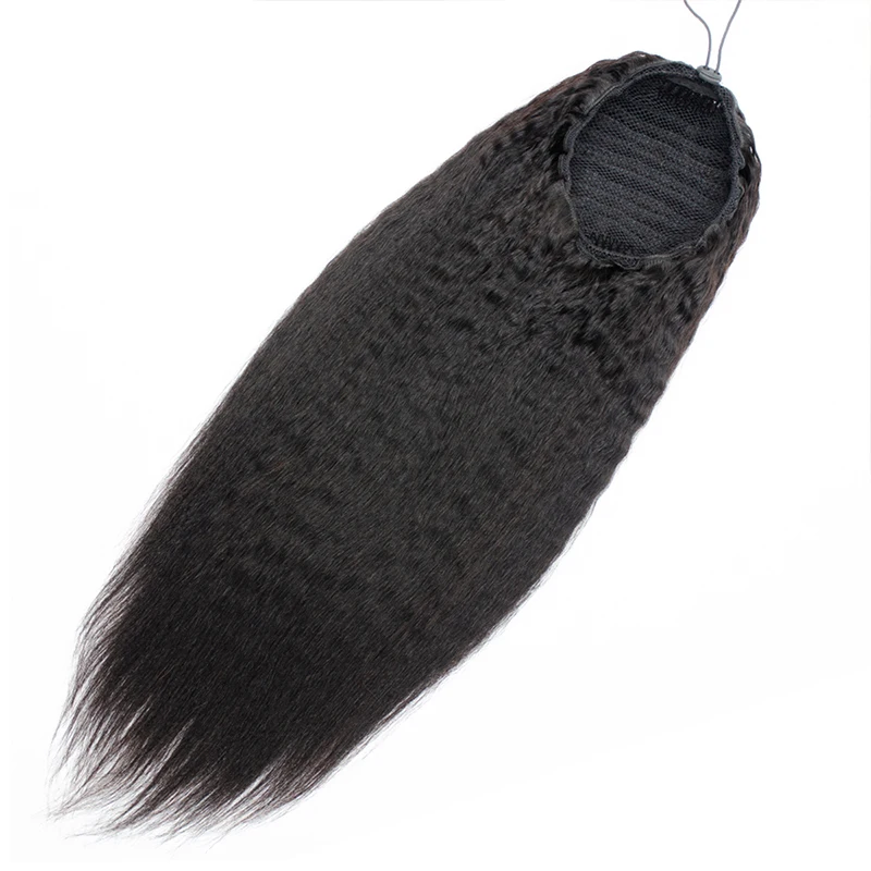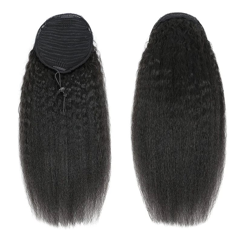 Kinky Straight Ponytail Human Hair Extension 100% Real Human Hair Wrap Around Drawstring In Ponytail Natural Black #1B For Women