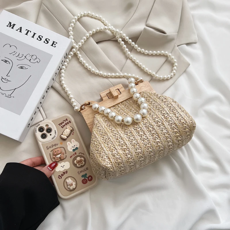 Nice Pearl Chain Straw Bag Women Hand-Woven Handbags Women Summer Wooden Rattan Shoulder Bag Brand Luxury Crossbody Bag